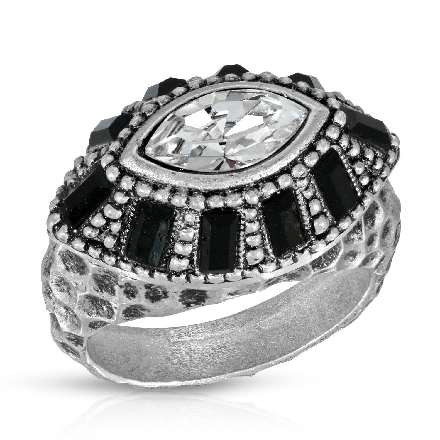 A richly designed hammered domed ring featuring two tone crystals & available in 3 colors.